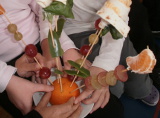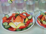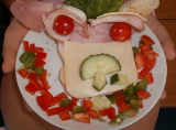 Dvě děvčata a kluk ze základní školy v Chrášťanech vytvořili tým a přihlásili do soutěže FIT SVAČINA 2015 talíř se šunkou a toastovým chlebem, bohatě ozdobený zeleninou.