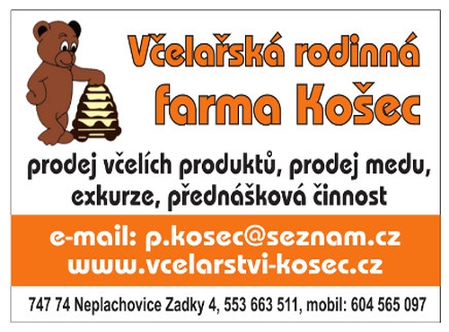Rodinná včelařská farma Košec | ![]() Rodinná včelařská farma KošecRodinná farma se nachází v malé vesničce na úpatí Nízkého Jeseníku, včelstva jsou umístěna na okraji zdejších lesů a luk. Ke včelaření mě přivedl můj děda, ale včelařil i jeho otec, tedy můj pradědeček. Včelaření bylo nejprve mým koníčkem, včelařská farma vznikla v roce 2006. Filozofií farmy je ryze rodinný podnik, který klade důraz na soužití s přírodou a zaměřuje se na výrobu kvalitních druhových medů. Adresa: Rodinná včelařská farma Košec Telefon: 604 565 097 E-mail: p.kosec@seznam.cz Webové stránky: www.vcelarstvi-kosec.cz Možnost exkurzí: ANO Co u nás uvidíte? Včelařský provoz, včelnici, chov koz, králiků, drůbeže a prasat. Ukázka výroby svíček ze včelího vosku. Promítané prezentace a přednášky. Maximální počet účastníků: 40